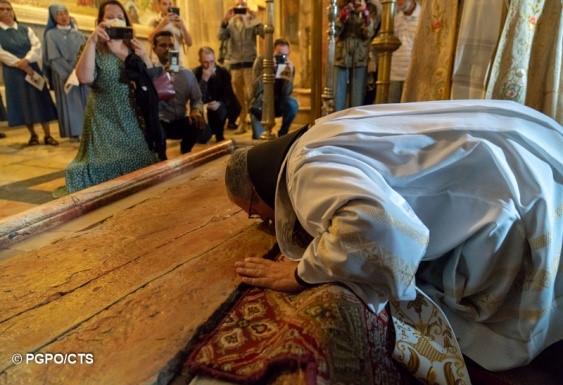 الأب فوساريلي يقبّل الحجر الذي دهن جسد يسوع بالطيب