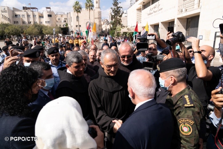 لدى وصوله إلى ساحة المهد، مقابل مدخل الكنيسة، تلقى الرئيس العام ترحيبًا حارًا من قبل مجموعة كبيرة من الممثلين عن المجتمع المدني والمسيحي في بيت لحم. وفي نهاية الاحتفال الليتورجي المخصص للدخلات الاحتفالية بشكل عام، استقبل حارس الأرض المقدسة الأب فرانشيسكو باتون، الرئيس العام مرافقًا إياه في زيارته داخل كنيسة المهد. وبعد أن رحب بممثلي الكنائس الثلاثة التي تعيش معًا داخل بازيليك بيت لحم، قاد الأب الحارس الرئيس العام إلى كنيسة القديسة كاترينا، التابعة للقسم الفرنسيسكاني من كنيسة المهد.