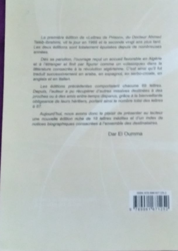 Ahmed TALEB IBRAHIMI “Lettre de prison (1957-1961)”, Dar EL Ouma, Troisiėme ėdition augmentée, Mai 2001, EDition janvier 2010, Alger, Algérie , Contient 177 Pages.