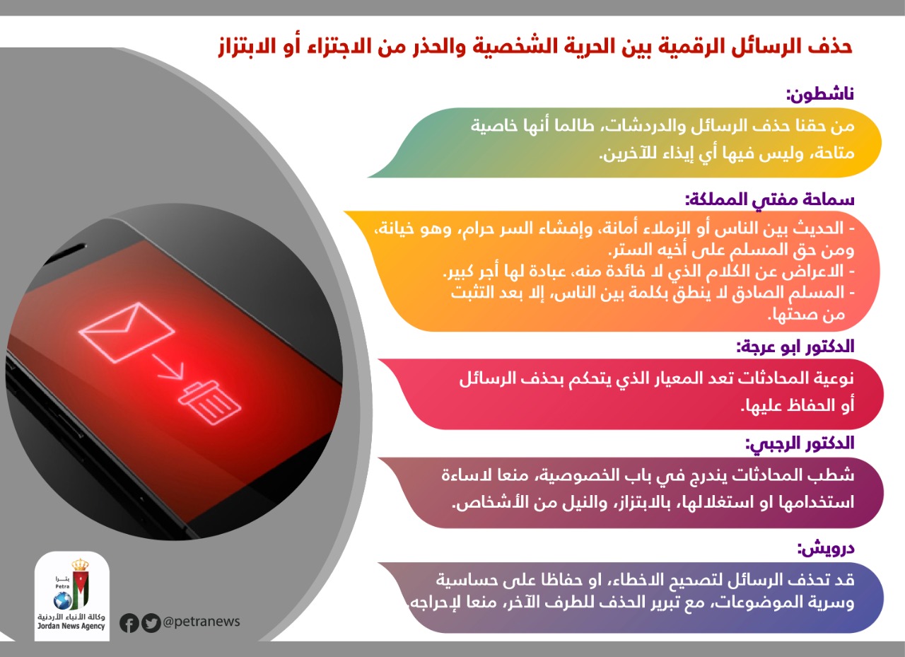 ويدع هؤلاء المتخصصون إلى احترام قيم التواصل، وعدم إفشاء الاسرار، وضرورة تعزيز الثقة البينية، وتفهم قيام أحدهم بحذف رسائله، طالما بُنيت أرضية العلاقات على المحبة والاحترام، وعلى الطرف الآخر، كما يشددون، أن لا يُفسر حذف الرسائل ضده، فليس هو المستهدف لشخصه، بل أن الأمر يتعلق بحق المرء في حماية نفسه من أي تداعيات غير محسوبة جراء تبادله المعلومات مع آخرين، خاصة أن طبيعة العلاقات بين البشر خاضعة للتغيّر، مع كل ما يحمله ذلك من تبدل للمواقف. ولدائرة الإفتاء العام ما تقوله في هذا الخصوص، حيث يذهب سماحة مفتي المملكة الشيخ عبد الكريم الخصاونة، في حديث خاص لـ (بترا): إلى أن الكلام نعمة تستوجب الشكر، وحق نعمة الكلام أن تكون طريقاً للخير مغلاقاً للشر، لقوله تعالي (لَا خَيْرَ فِي كَثِيرٍ مِنْ نَجْوَاهُمْ إِلَّا مَنْ أَمَرَ بِصَدَقَةٍ أَوْ مَعْرُوفٍ أَوْ إِصْلَاحٍ بَيْنَ النَّاسِ وَمَنْ يَفْعَلْ ذَلِكَ ابْتِغَاءَ مَرْضَاتِ اللَّهِ فَسَوْفَ نُؤْتِيهِ أَجْرًا عَظِيمًا).