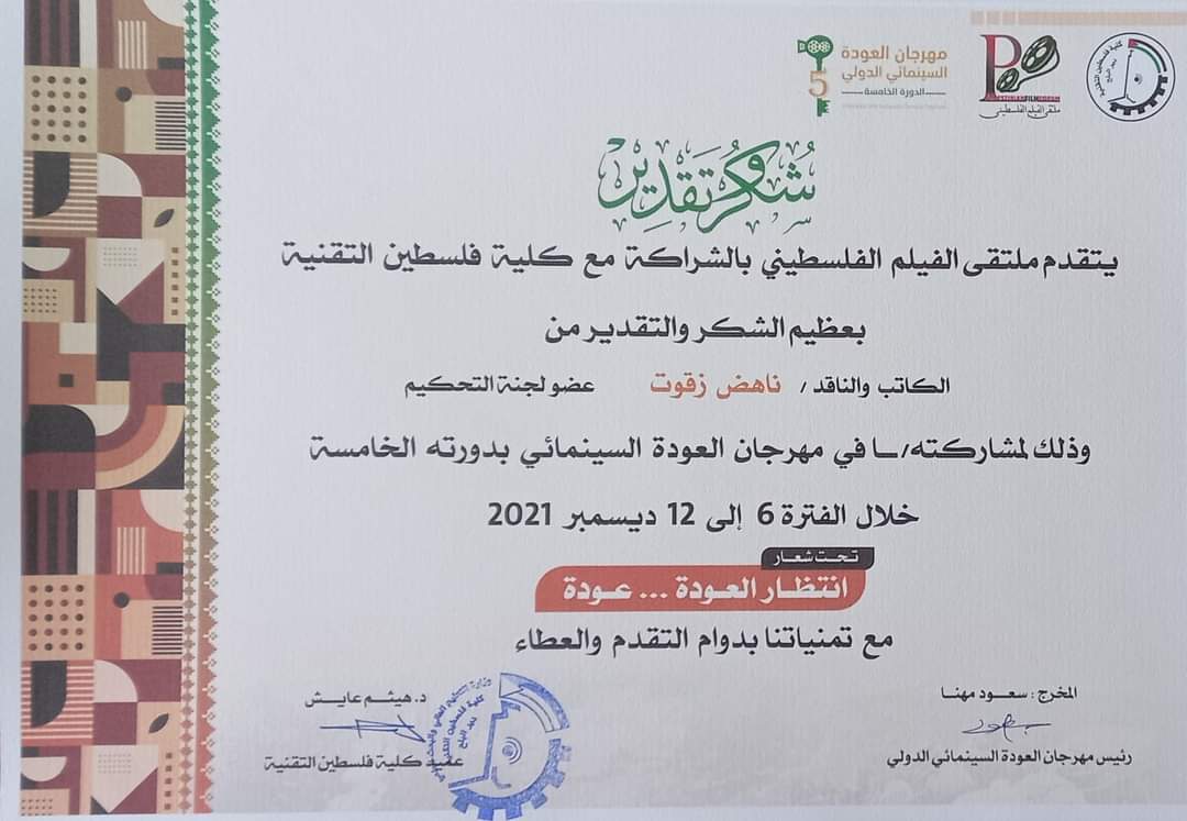 شهادة شكر وتقدير في ختام مهرجان العودة السينمائي الدولي.. ناهض زقوت