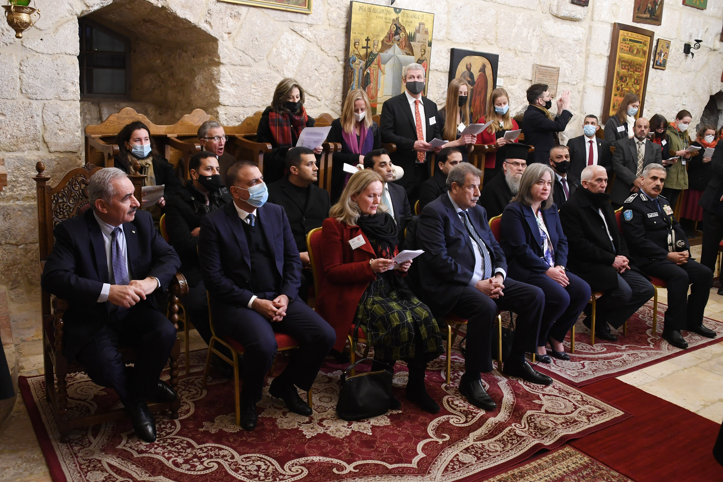 بيت لحم – البيادر السياسي:ـ شارك رئيس الوزراء محمد اشتية، مساء اليوم الجمعة، في قداس منتصف الليل للكنيسة الأنجليكانية في دير الروم الأرثوذكس بمدينة بيت لحم.