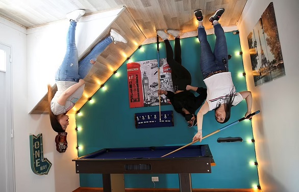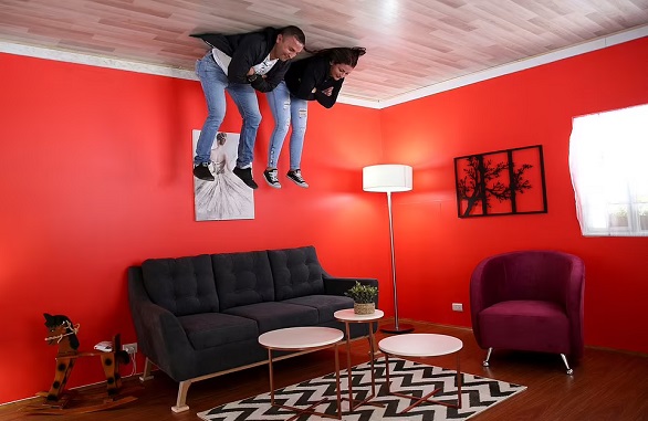 وبني المنزل في بلدة غواتافيتا الكولومبية قرب العاصمة بوغوتا. وداخل المنزل، المعروف باسم كازا لوكا، البيت المجنون، يمشي الزوار على السقف بينما يوضع الأثاث فوقها.