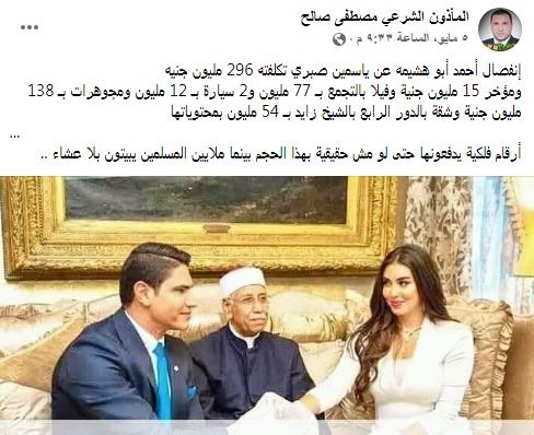 وقال المأذون الشرعي مصطقى صالح في منشوره على موقع “فيسبوك”: ” إنفصال أحمد أبو هشيمة عن ياسمين صبري تكلفته 296 مليون جنيه، ومؤخر 15 مليون جنيه، وفيلا بالتجمع بـ 77 مليون، و 2 سيارة بـ 12 مليون، ومجوهرات بـ 138 مليون جنيه، وشقة بالدور الرابع بالشيخ زايد بـ 54 مليون بمحتوياتها،