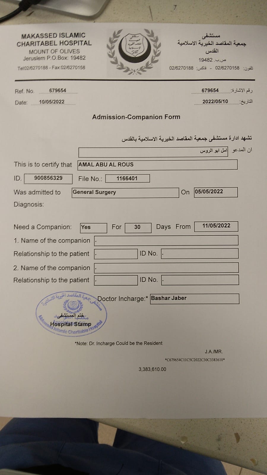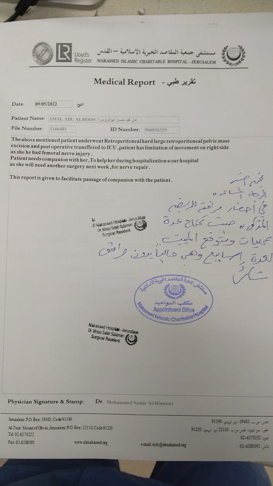 مواطنة تناشد من أجل السماح لأحد من أقاربها بمرافقتها برحلة العلاج في مستشفى المقاصد