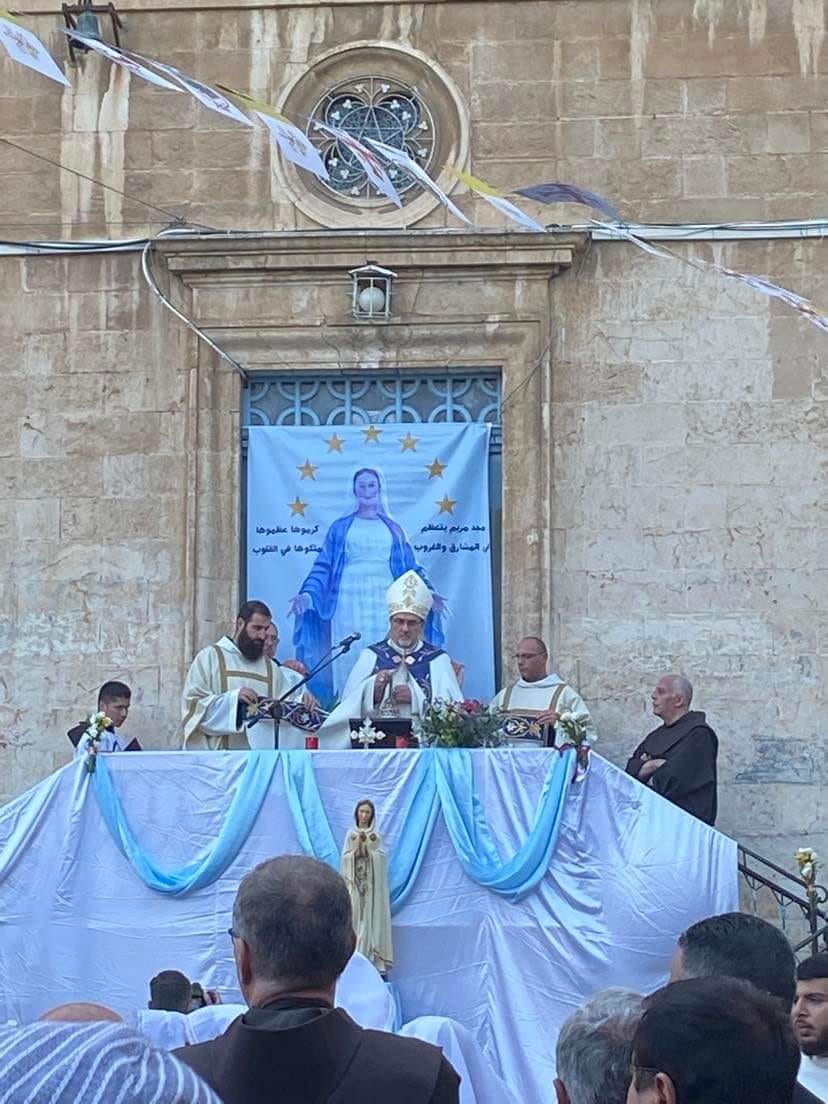 بدأ الاحتفال بتقديم باقات من الزهور والنذور للأطفال بلباسهم ثوب أزرق تكريما لمريم العذراء ولذكرى الشهيدة الفلسطينية ابنة الأيمان والرجاء والمحبة شيرين أبو عاقلة وبالقرب من الهيكل المقام وسط ساحة مار فرنسيس.تقدم كافة المؤمنون سيرا على الأقدام الى مذبح الرب في كنيسة المخلص الراعوية وقد أقيمت الذبيحة الالهية برئاسة الاب أمجد صبارة كاهن الرعية والاب لويس خوري عاونهم لفيف من كهنة الآباء الفرنسيسكان والشدياق باسم غطاس ولفيف من والشمامسة،والقى الاب أمجد صبارة عظة بليغة عن زيارة مريم العذراء وهي حامل بيسوع المسيح الى اليصابات في قرية عين كارم وعن مكانة السيدة العذراء في حياة المؤمنين وأكد أهمية تمسك الأسرة بالقيم الايمانية الروحية والرجاء والمحبة .كما هنأ الاب أمجد صبارة البطريرك بيير باتيستا بيتسا بالا على مشاركته الحفل الديني التقليدي السنوي،وفور انتهاء القداس الاحتفالي القى بطريرك القدس للاتين رئيس الاساقفة بيير باتيستا كلمة هنأ فيها الحضور باختتام شهر آيار المريمي المكرس من أجل السلام والخير والأمن والآمان والمحبة بين كافة المؤمنين في هذه الارض المقدسة والاردن والجزيرة العربية ولبنان ومصر ووقف الحرب في سوريا والعراق وعودة كافة المهجرين والمخطوفين من مطارنة وكهنة وابناء الديار الى كنائسهم وبيوتهم وديارهم.