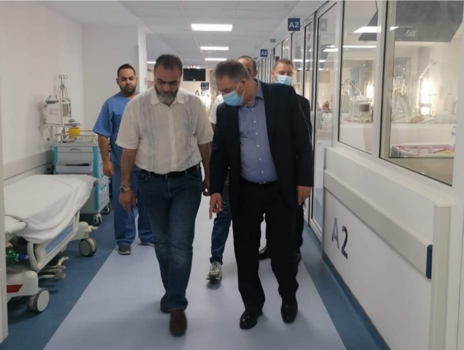 ثم جال مطمئناً على كافة المرضى في قسمي العناية الفائقة والعناية القلبية وباقي أقسام المستشفى متفقداً سير العمل بداخلها .
