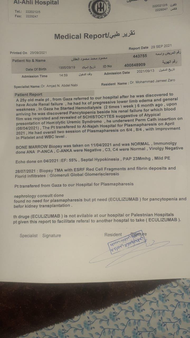 واضاف أنه عند دخول إبني المريض محمود مستشفى ستايل سانوريك باسطنبول برفقة شقيقته خضراء المتبرعة حيت كان يغسل أسبوعيا ٣ مرات تفاجأنا بعد أن أجري له فحوصات من جديد تمهيدا للزراعة أن لديه مشكلة في الدم وبحاجة ماسة إلى علاج ودواء مكثف و فوري من صنف SOLIRIS ، مشيرا إلى أن هذا العلاج متوفر وبأسعار مرتفعة وهو لا يستطيع شرائه وضروري أن يأخد منه ٣ جرعات أسبوعيا لمدة شهر وبعد الزراعة شهر اخر.