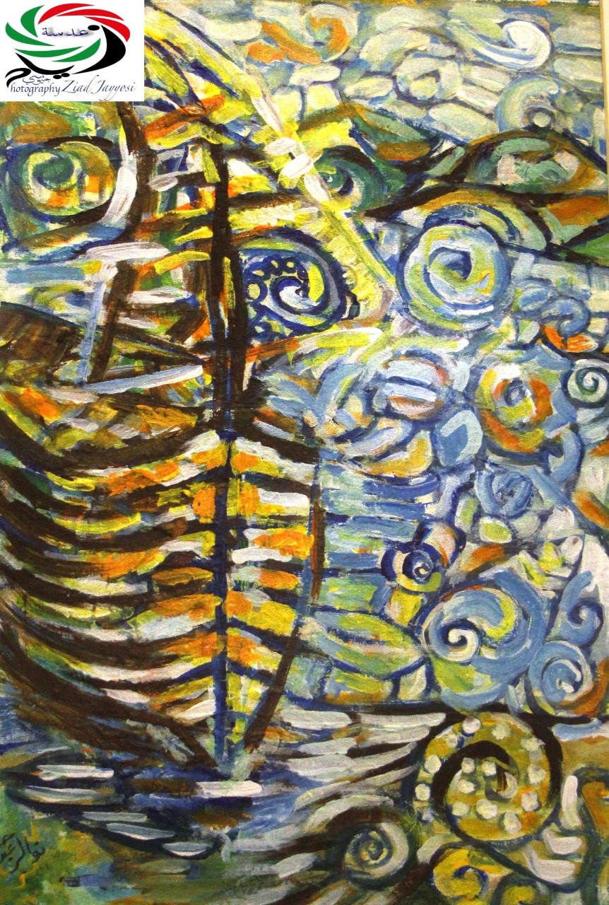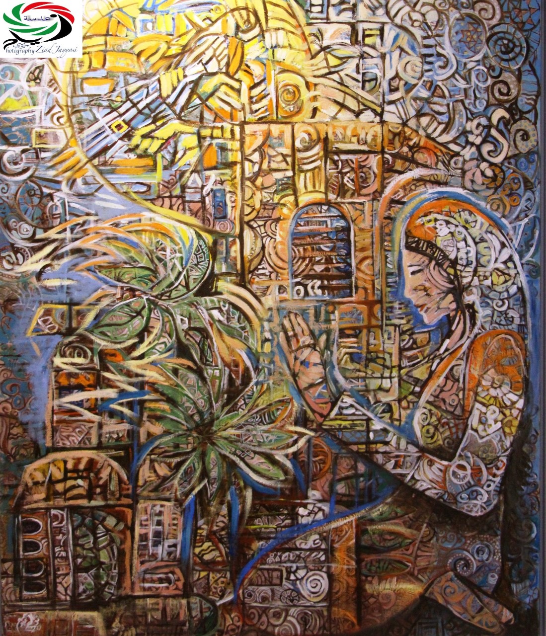 اللوحة الثانية: وهنا ابرزت دور المرأة وانتمائها للوطن فجعلت قلب اللوحة وجهين متعاكسين لامرأة، ترتدي على رأسها ورقبتها غطاء مزخرف برموز زخرفات فلسطينية، وعلى اليمين بالنسبة للمشاهد تنظر الى الوطن ممثلا بقبابه ومبانيه التراثية وعلى أعلى قبة يقف طائر ينظر الى السماء وكأنه ينتظر الفرح القادم بالحرية للوطن، ومن جهة اليسار بالنسبة للمشاهد نرى أن الزخرفة على الوجه تمازجت مع ابنية الوطن التراثية وتنظر الى مشهد من القباب والأبنية التراثية وفوق القباب الشمس مزخرفة بسنابل القمح، وخلفية اللوحة سماء زرقاء تتقاطع بها الخطوط والزخرفات والورود، وهذه اللوحة التي حفلت بالرمزية كانت من اللوحات التعبيرية المتميزة في المعرض.