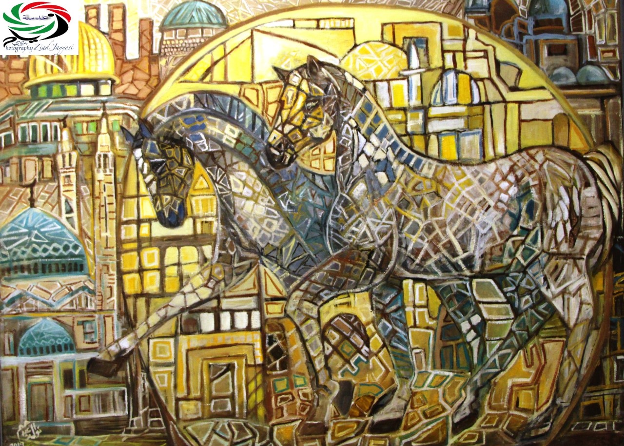 الخيل: الخيل معقود بنواصيها الخير ويظهر انها كانت الفكرة التي دارت حولها ست لوحات للخيول، وتميزت ثلاث لوحات منها بربط الخيل بالوطن، فالخيل رمز للنصر القادم والتحرير وهذا ما يتمثل بشكل خاص في اللوحة الأولى حيث اثنان من الخيول يتجهان نحو القدس والأقصى وقبة الصخرة، وهما أمام دائرة تحتوي بداخلها مشهد لأبنية تراثية ومساجد وقباب،ويغلب على الدائرة اللون الأصفر كما أشعة الشمس، بينما خارج الدائرة تتألق قبة الصخرة الذهبية وحولها ثلاث قباب لمساجد من الخزف الأزرق، بإشارة رمزية للخيول التي ترمز ليوم الحرية والنصر، ولكن من الجدير بالملاحظة وجود هذه القباب الثلاثة بالخزف الأزرق وهو غير مستخدم في فلسطين بشكل عام وبالقدس بشكل خاص، وهو من نمط القباب والمساجد المنتشرة في العراق الشقيق، بينما في اللوحة الثانية نرى الجواد يتجه بعنفوان نحو الأبنية التراثية التي ترمز لأبنية فلسطين وخلفية اللوحة أشارات للطبيعة الجميلة، وغلب على اللوحة اللون الأزرق النيلي بأسلوب الزخرفة، بينما اللوحة الثالثة لم تخرج عن فكرة اللوحة الثانية وإن اختلفت الألوان، أما اللوحات الثلاثة الأخرى فاعتمدت مشاهد مختلفة لوضعية الخيول ضمن تمازج وانصهار بين زخرفة فضاء اللوحات وأجساد الخيول.