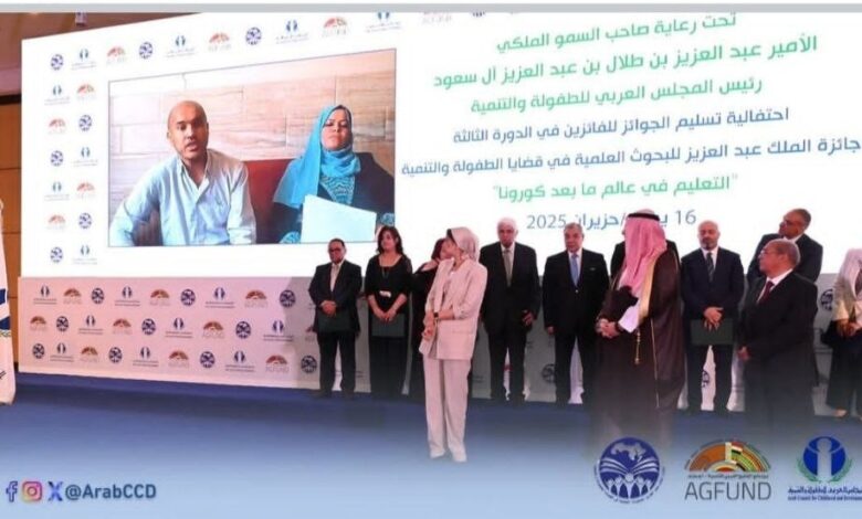 وقد نال الجائزة كل من الدكتور خليل إسماعيل ماضي، والدكتورة آية خليل أبو ندا من جامعة فلسطين في قطاع غزة، حيث جرى الإعلان عن النتائج وتسليم الجوائز خلال حفل رسمي أقيم يوم الإثنين الموافق 16 يونيو 2025، برعاية وحضور سمو الأمير عبد العزيز بن طلال آل سعود، رئيس المجلس العربي للطفولة والتنمية ورئيس مجلس أمناء برنامج الخليج العربي للتنمية “أجفند”، وبمشاركة عدد من الوزراء والسفراء والملحقيات الثقافية من الدول العربية.