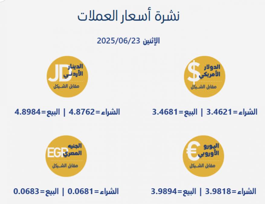 رام الله- البيادر السياسي:ـ جاءت أسعار صرف العملات مقابل الشيقل الإسرائيلي، اليوم الإثنين، بحسب سلطة النقد الفلسطينية، على النحو التالي: