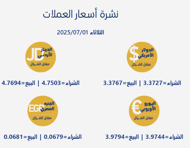 رام الله – البيادر السيسي:ـ جاءت أسعار صرف العملات مقابل الشيقل الإسرائيلي، اليوم الثلاثاء، بحسب سلطة النقد الفلسطينية، على النحو التالي: