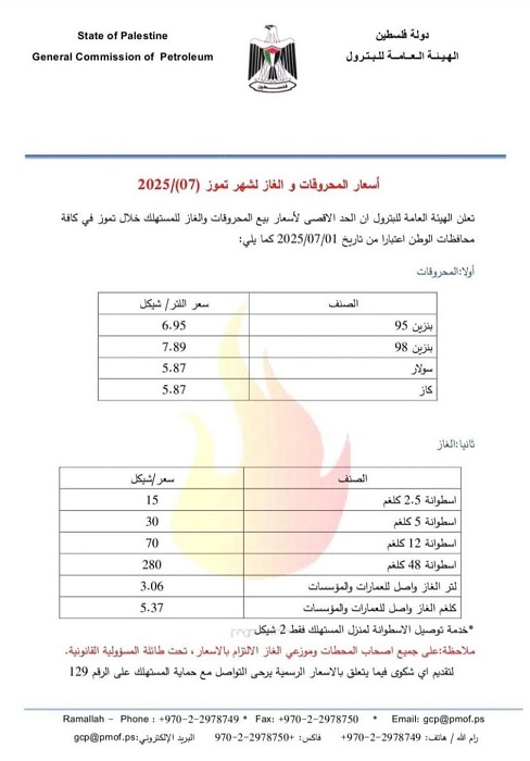 رام الله – البيادر السياسي:ـ أعلنت الهيئة العامة للبترول، مساء اليوم الاثنين، أسعار المحروقات والغاز لشهر تموز (7/2025)، على النحو التالي: