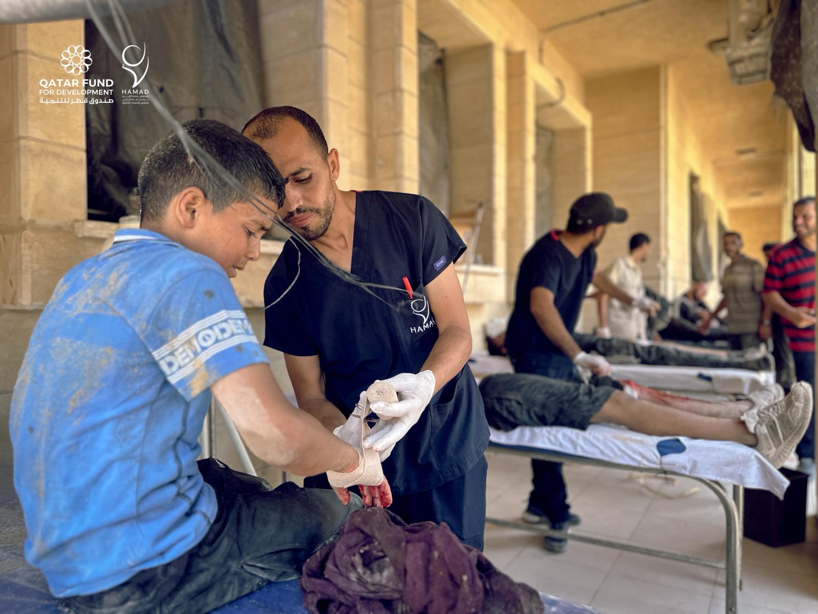 The State of Qatar has established a first aid station at HH The Father Amir Sheikh Hamad bin Khalifa Al Thani Hospital for Rehabilitation and Prosthetics in Gaza, funded by Qatar Fund for Development, to treat emergency cases in northern Gaza and injured individuals waiting for aid.