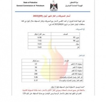 رام الله – البيادر السياسي:ـ أعلنت الهيئة العامة للبترول، مساء الأحد، أسعار المحروقات والغاز لشهر أيلول (9/2025)، على النحو التالي: