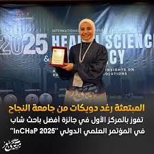 رغد دويكات من جامعة النجاح الوطنية تفوز بالمركز الأول بجائزة أفضل باحث شاب بالمؤتمر العلمي الدولي بكولالمبور