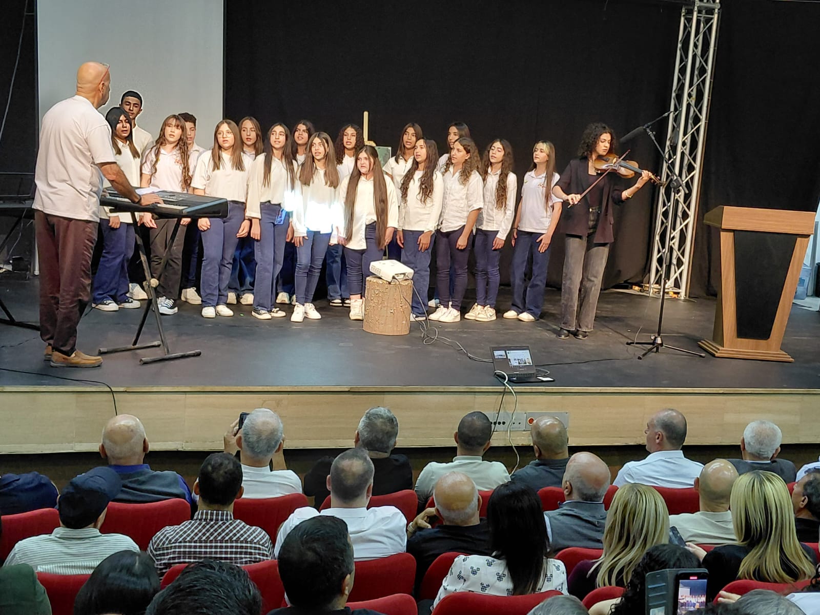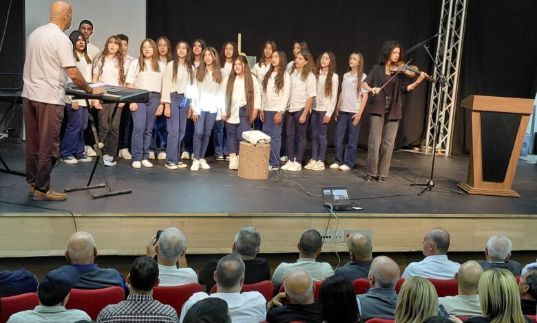 بعدها كانت استراحة فنية مع جوقة “المدرسة الشاملة أ على اسم الشيخ صالح خنيفس”، بقيادة الأستاذ رياض شهاب، التي قدمت أنشودتين من نظم الشاعر ماجد عليان وتلحين رياض شهاب، وهما نشيدي “المدرسة الشاملة أ” و”مدرسة العين الابتدائية”، وقامت طالبة الصف العاشر مديحة أبو حمود بعزف لحن “النهر الخالد” على آلة الكمان.