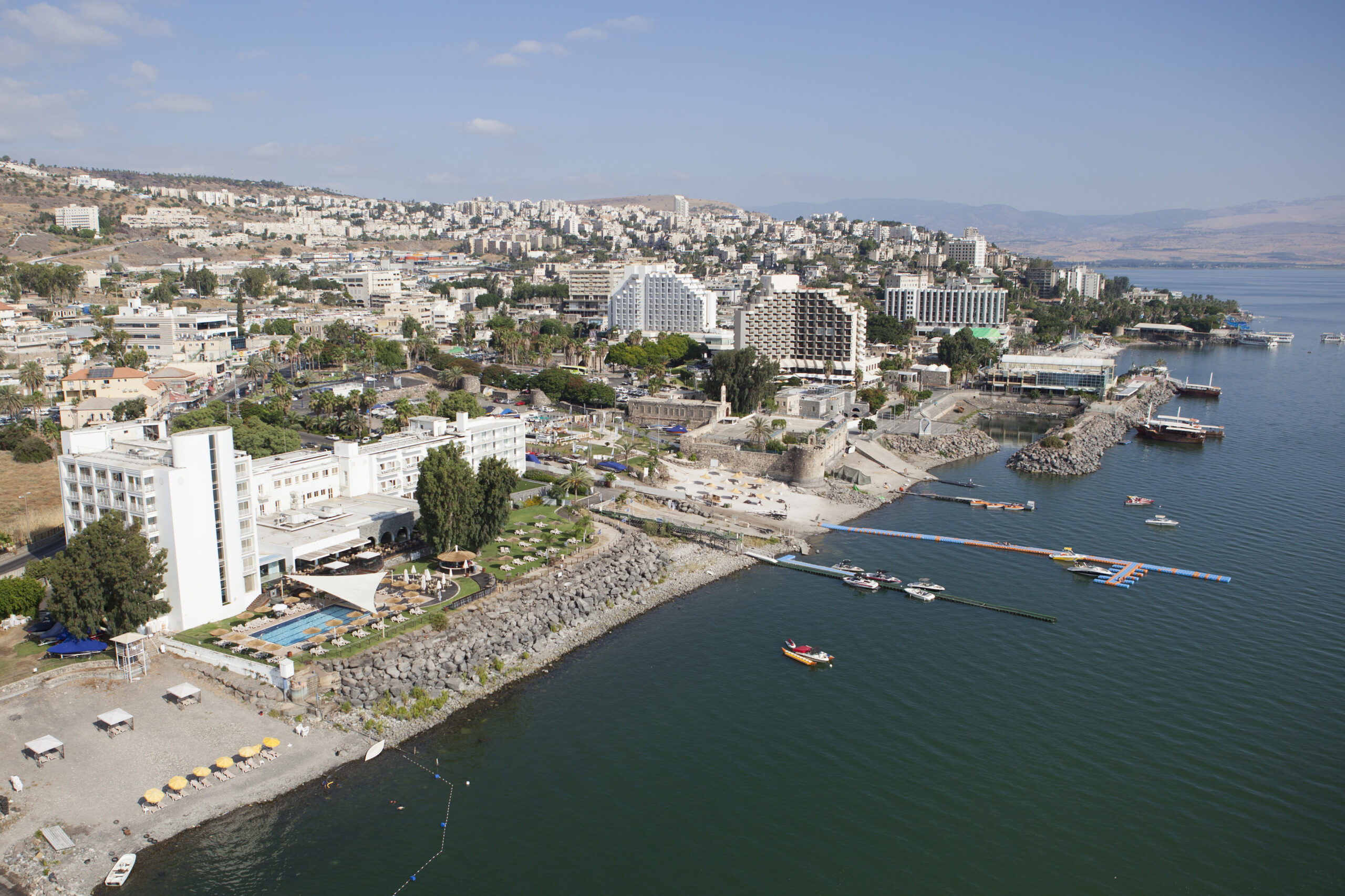 Tiberias is a city on the western shore of the Sea of Galilee in the Lower Galilee. Established in 20 CE, it was named in honour of the emperor Tiberius.Tiberias has been venerated in Judaism since the middle of the 2nd century CE and since the 16th century has been considered one of Judaism's Four Holy Cities, along with Jerusalem, Hebron and Safed.In the 2nd-10th centuries, Tiberias was the largest Jewish city in the Galilee and the political and religious hub of the Jews of Palestine. According to Christian tradition, Jesus performed several miracles in the Tiberias district, making it an important pilgrimage site for Christians. Tiberias has historically been known for its hot springs, believed to cure skin and other ailments, for thousands of years.The picture shows an aerial view of the city. Photo by Itamar Grinberg.