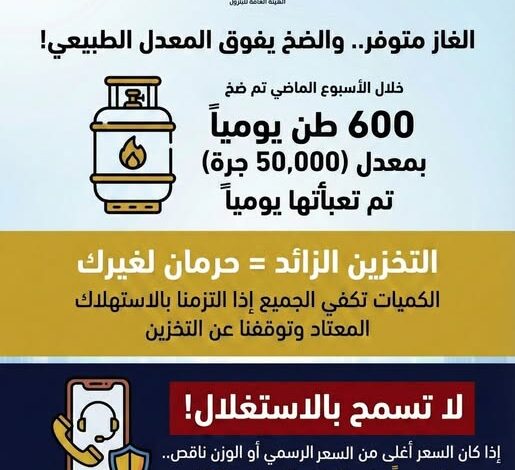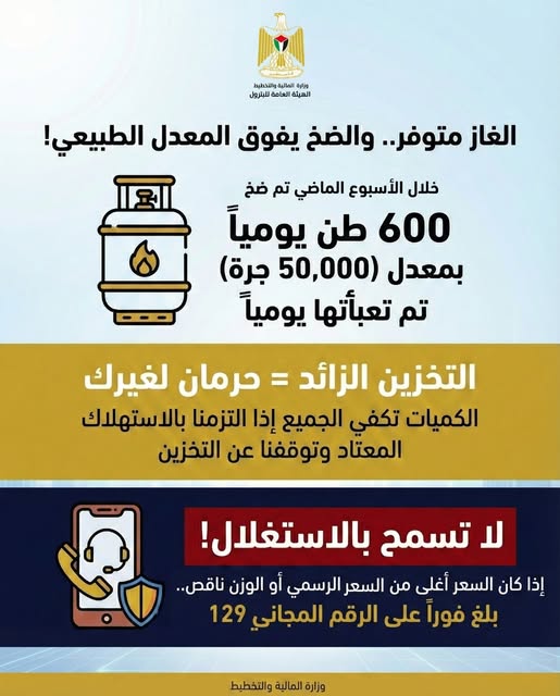 ️ حرصاً على ضمان وصول الغاز للجميع، نود طمأنتكم بأن كميات الغاز متوفرة في الأسواق وتفوق المعدل الطبيعي. خلال الأسبوع الماضي، تم ضخ 600 طن يومياً، وهو ما يعادل تعبئة 50,000 جرة غاز يومياً. هذه الكميات كافية لتلبية احتياجات الجميع إذا التزمنا بالاستهلاك المعتاد. 🔴 تذكروا: التخزين الزائد = حرمان لغيرك. ندعوكم إلى عدم التخزين غير المبرر، لضمان حصول كل مواطن على حصته العادلة. 🔴 لا تسمحوا بالاستغلال! إذا واجهتم أي محاولة لرفع الأسعار عن السعر الرسمي أو التلاعب في الوزن، بلغوا فوراً على الرقم المجاني لحماية المستهلك 129.
