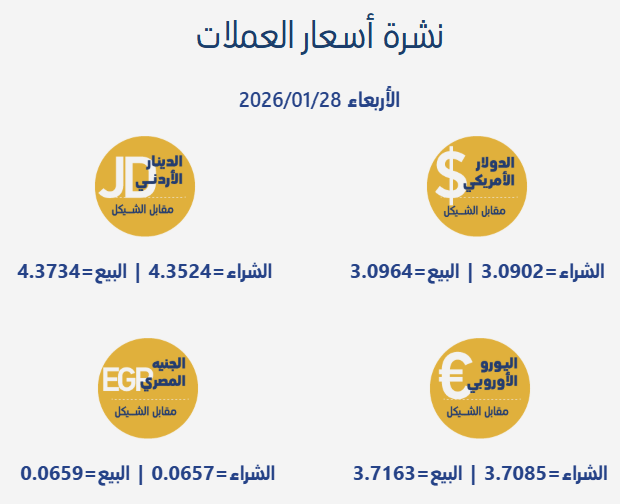 القدس المحتلة- البيادر السياسي:ـ جاءت أسعار صرف العملات مقابل الشيقل الإسرائيلي، اليوم الأربعاء، بحسب سلطة النقد الفلسطينية، على النحو التالي: