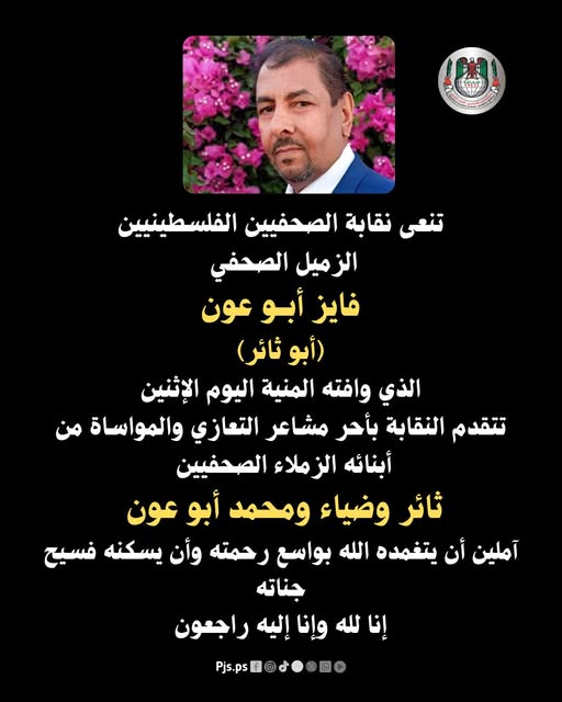 نقابة الصحفيين الفلسطينيين تنعى الزميل الصحفي فايز أبو عون (أبو ثائر)