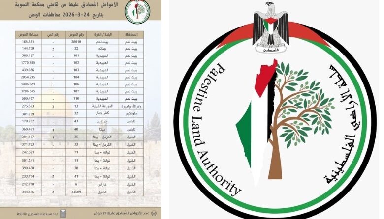 رام الله ـ البيادر السياسي: ـ  أعلنت سلطة الأراضي عن إنجاز جديد ضمن أعمال مشروع تسوية الأراضي والمياه، تمثل في المصادقة على 21 حوض تسوية من قبل قاضي التسوية، بمساحة إجمالية بلغت 14,412 دونما، وإصدار 1804 سندات تسجيل بعد استكمال الإجراءات القانونية المعتمدة.