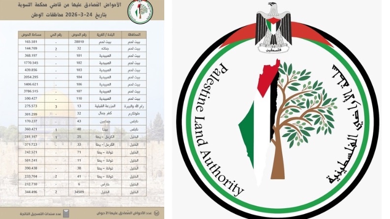 وأوضحت سلطة الأراضي في بيان صدر عنها، اليوم الخميس، أن الأحواض المصادق عليها شملت محافظات الخليل وبيت لحم ونابلس ورام الله والبيرة وطولكرم، في إطار استكمال تنفيذ أعمال التسوية وفق الخطة الوطنية المعتمدة.