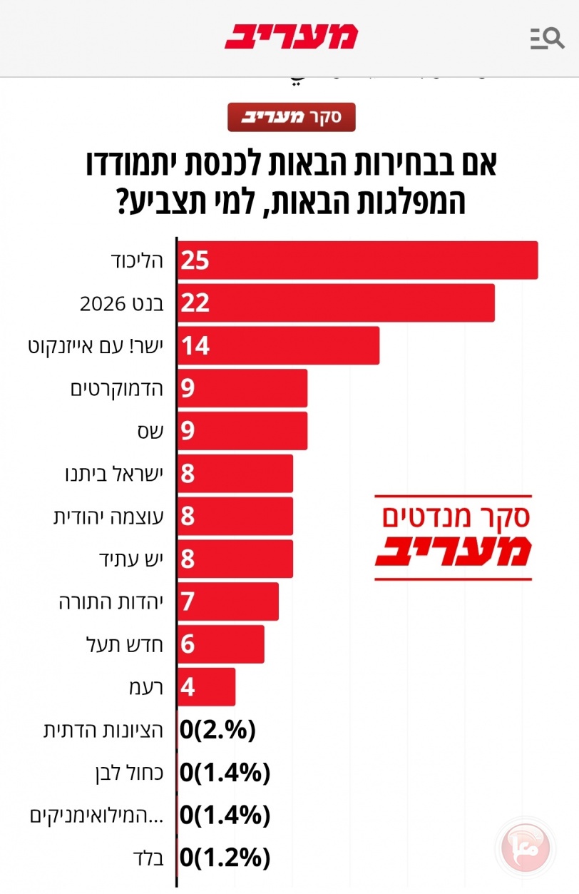 في كتلة المعارضة، تكتسب ثلاثة أحزاب المزيد من المقاعد: حزب بينيت 2026 (22 مقعدًا)، وحزب يشار! بقيادة غادي آيزنكوت (14 مقعدًا)، وحزب يش عتيد (8 مقاعد). في المقابل، يخسر حزب يسرائيل بيتينو (8 مقاعد) والحزب الديمقراطي (9 مقاعد) مقاعدهما.