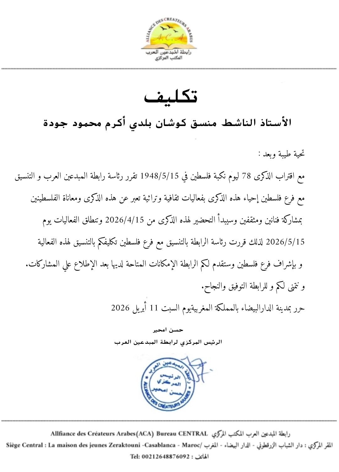 غزةـ البيادر السياسي ـ كلفت رابطة المبدعين العرب عن تكليف منسق كوشان بلدى الناش أكرم محمود جودة عن الاشراف على فعاليات احياء الذكرى (78) للنكبة على ان تكون المشاركة في الفعاليات بشكل افتراضي وتدعو الرابطة جميع المبدعين من مختلف الاعمار الى تقديم ابداعاتهم في شتى المجالات دعما لهذه الفعالية وبمشاركاتكم نرتقي ونسمو وسيتم الاعلان عن لجنة مختصة لمتابعة الاعمال المقدمة وتقييمها وتبدأ فترة استقبال المشاركات بتاريخ 14/4/ 2026