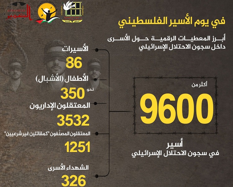 رام الله ـ البيادر السياسي : ـ أكدت مؤسسات الأسرى، أن عدد الأسرى الفلسطينيين والعرب في سجون الاحتلال تجاوز 9600 أسير وأسيرة حتى بداية نيسان/أبريل 2026، بارتفاع نسبته 83% مقارنة بما كان عليه قبل حرب الإبادة.