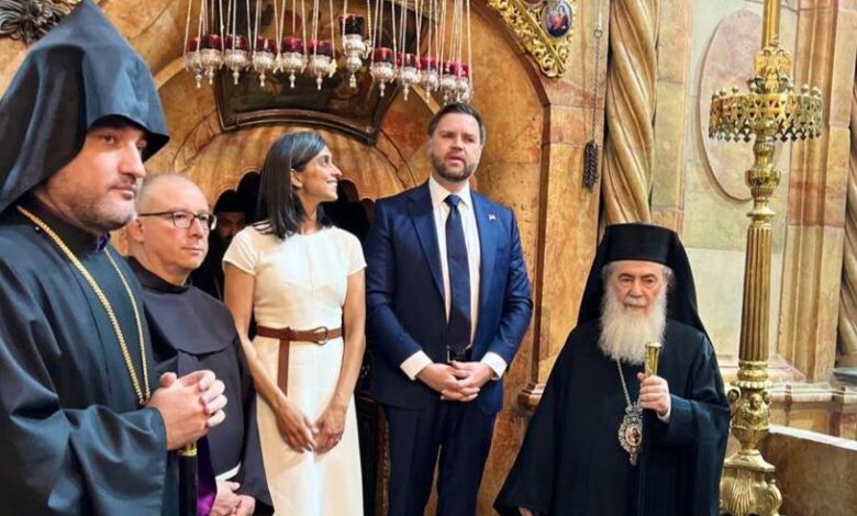 استقبل صاحب الغبطة البطريرك ثيوفيلوس الثالث، بطريرك القدس وسائر أعمال فلسطين والأردن، بمشاركة رؤساء الكنائس المشرفة على إدارة شؤون كنيسة القيامة في إطار ترتيبات الوضع القائم (الستاتيكو)، ممثلين إلى جانب غبطته بحراسة الأراضي المقدسة وبطريركية الأرمن، نائب رئيس الولايات المتحدة الأميركية السيد جي. دي. فانس وعقيلته السيدة أوشا فانس في كنيسة القيامة صباح اليوم.